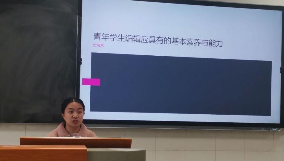 贺可意讲解了新媒体责编的定义、分类、任务与要求。她认为作为编辑需要一定的文字功底,也要能够熟练运用办公软件。同时,也强调编辑要注意新闻的真实性与知识产权,作为一名合格的编辑要培养政治修养与责任感。