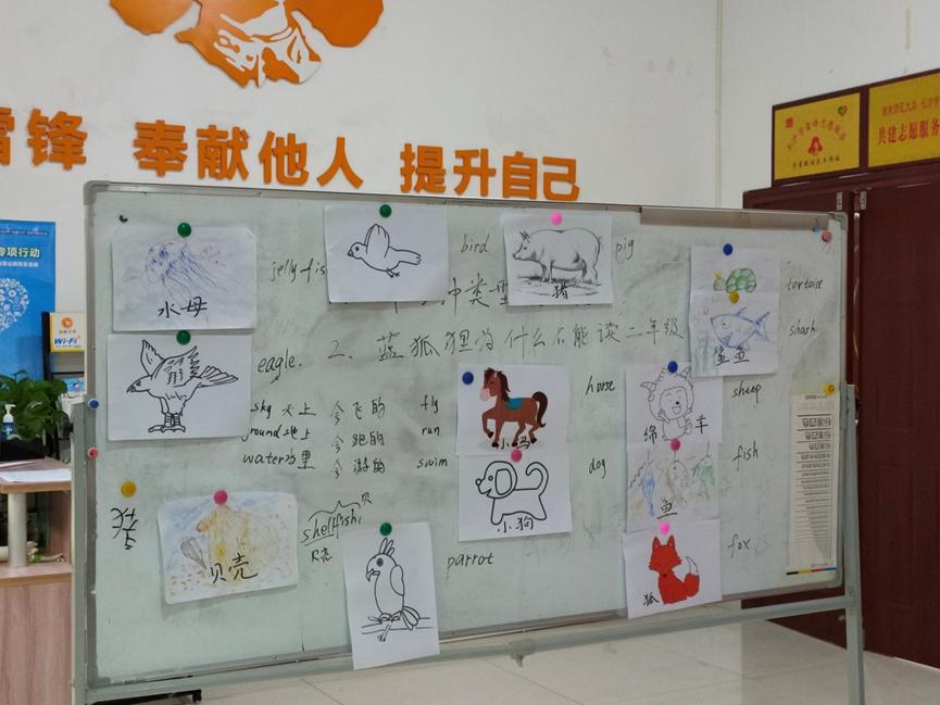 志愿者将故事涉及到的动物分为海陆空三类,并采用图文结合的方式教授英语单词。另外,“你演我猜”小游戏增加了课堂的趣味性,让小朋友们更加主动地学习相关知识。在整个课堂中,小朋友们踊跃参与,积极讨论老师提出的问题,他们还表示会用故事中蓝狐狸因逃避考试不能成功升入二年级的故事时刻警醒自己,认真学习,勇敢的面对挑战。