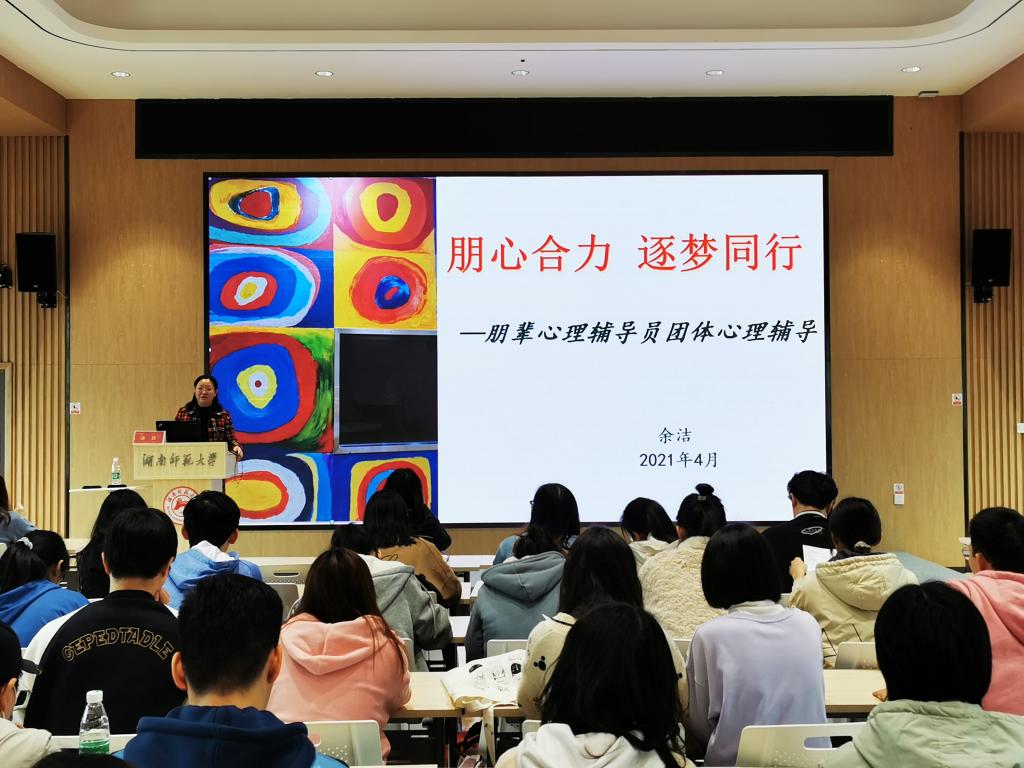 (通讯员 王政 陈可颐 夏秦萍)为迎接5•25大学生心理文化节,营造良好的心理健康教育氛围,促进同学们心理健康发展,4月13日中午,太阳成官网于腾龙楼613多功能厅举办“5•25大学生心理文化节”开幕式暨朋辈心理辅导员技能培训,我校心理咨询中心主任余洁带来了一场题为“朋心合力,逐梦同行——朋辈心理辅导员团体心理辅导”的主题培训,2020级辅导员王耀光参加活动。此次活动由太阳成官网心理专干、2019级辅导员姚雯主持。