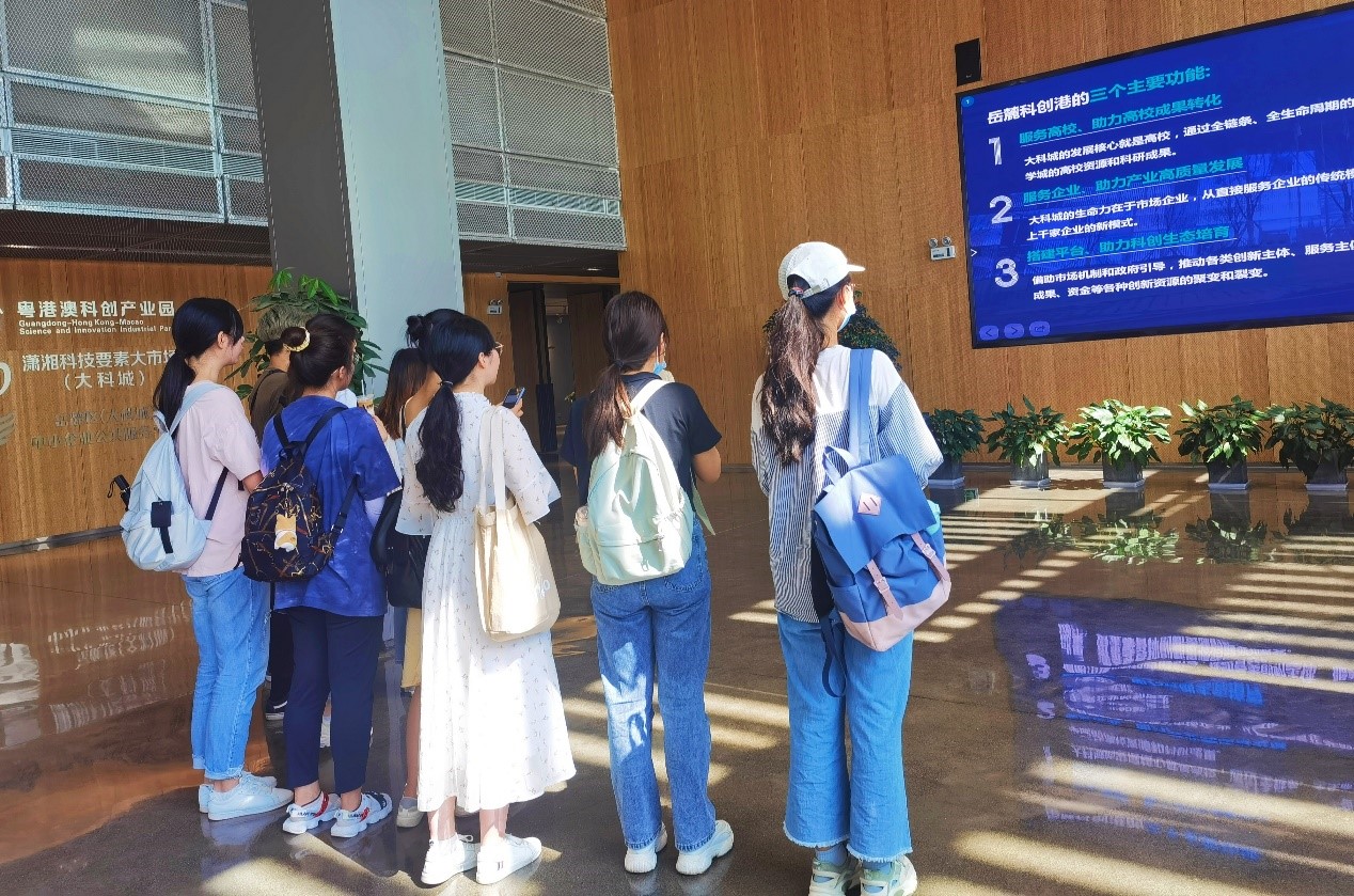 与课师生第一站抵达岳麓科创港。作为大科城推进科创服务、构建科创生态的重要平台,岳麓科创港汇聚了大批高技术科技创新服务企业,同学们在此充分了解了“创新引领”“产学结合”的新理念,深入学习“知识产权”“财税商法”等专业知识。在德必WE岳麓山人工智能产业中心,同学们观看了人工智能和智能制造发展历程的纪录片,拍摄了大量有专业术语和园区公示语的照片,为师生之后探讨、修改公示语翻译搜集素材。
