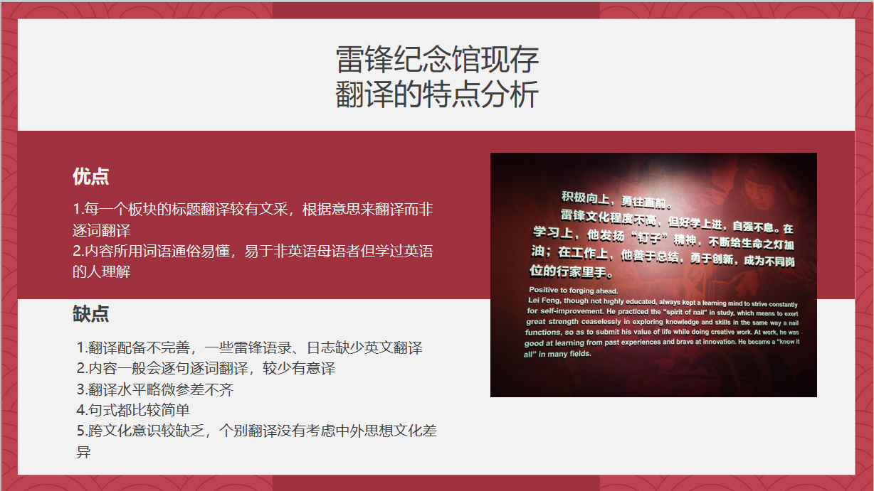 在此次会议上,何欣卉指出,结合调研团前期收集的素材可得出,目前雷锋纪念馆的英文翻译存在部分雷锋语录、日志缺少英文翻译,个别翻译缺乏跨文化意识,并就具体事例进行了分析。