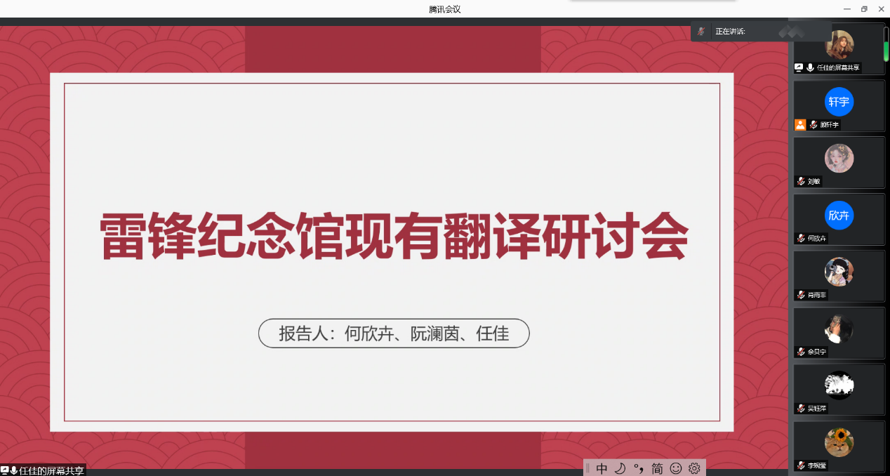 此次会议分为两个部分:分析雷锋纪念馆现存翻译的特点以及讨论雷锋纪念馆对文化翻译的需求。