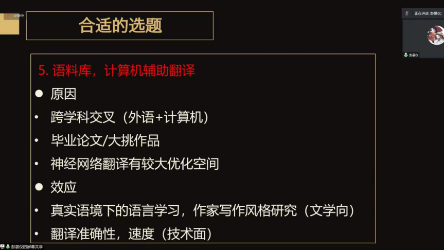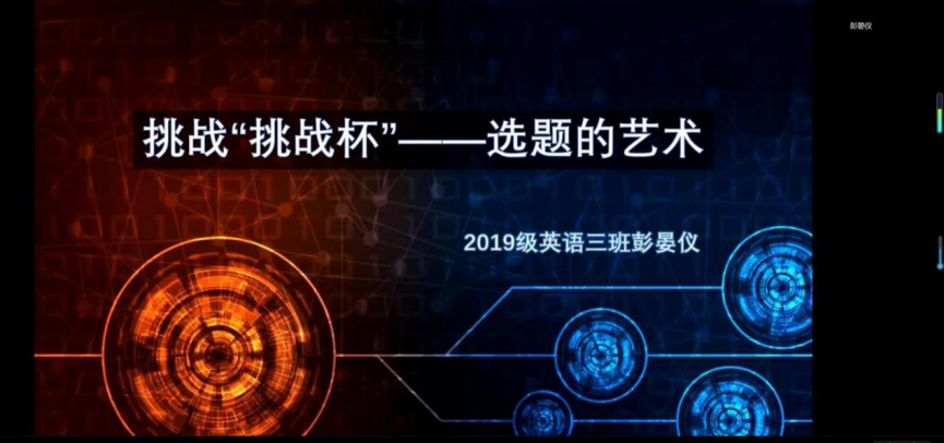 (通讯员 杜小朦)10月13日下午,太阳成官网团委青年创新创业指导工作部(以下简称青创)在腾讯会议上举办挑战杯课外学术科技作品竞赛宣讲会。本次宣讲会邀请曾获挑战杯大学生课外学术科技作品大赛红色专项活动省级二等奖、19级英语三班的彭晏仪担任主讲人。