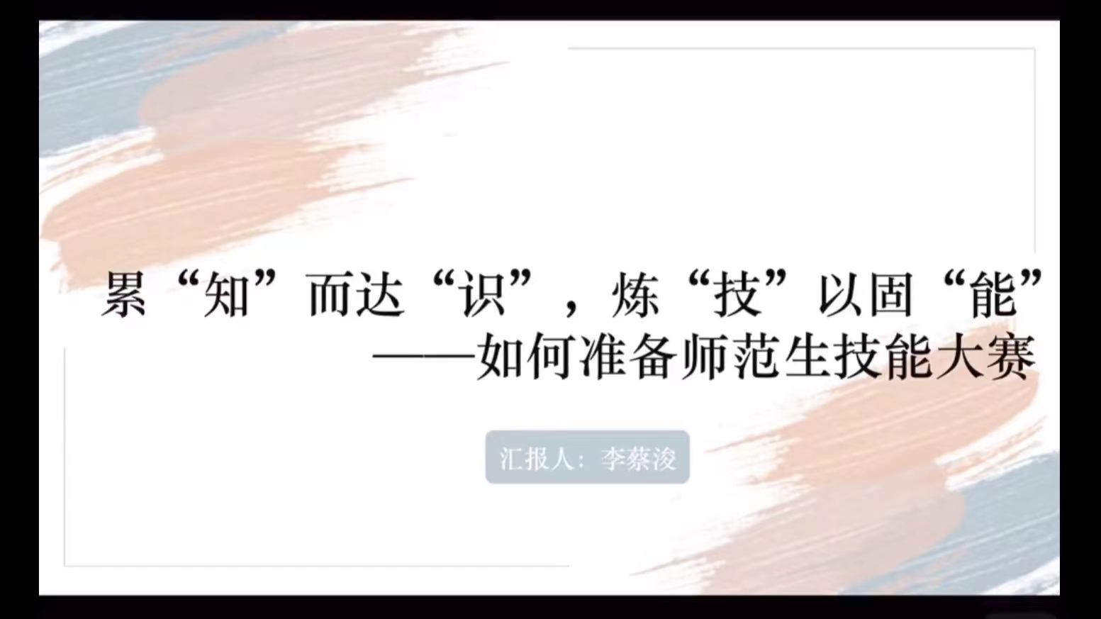 李蔡浚结合自身参赛经历,细致介绍了师范生技能大赛的相关情况,并从教师四大职业能力出发,提出了相关的建议。她鼓励同学们积极参与有关师范生技能提升的相关活动竞赛。互动环节,同学们就如何练字、如何规划大赛的前期准备时间等方面提出问题,主讲人一一耐心解答。