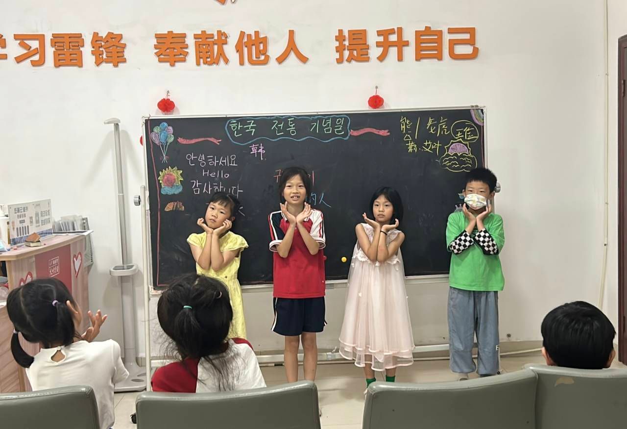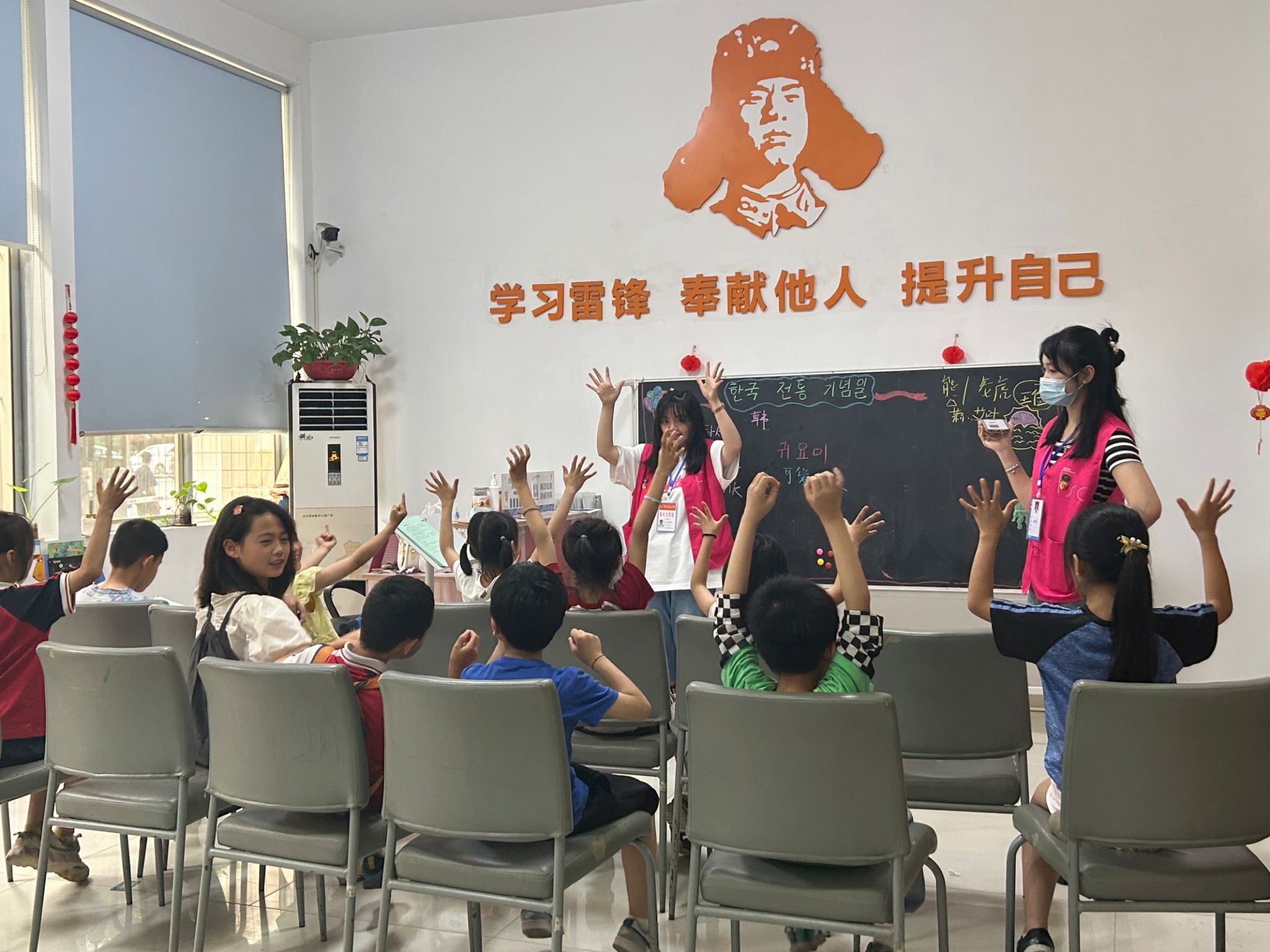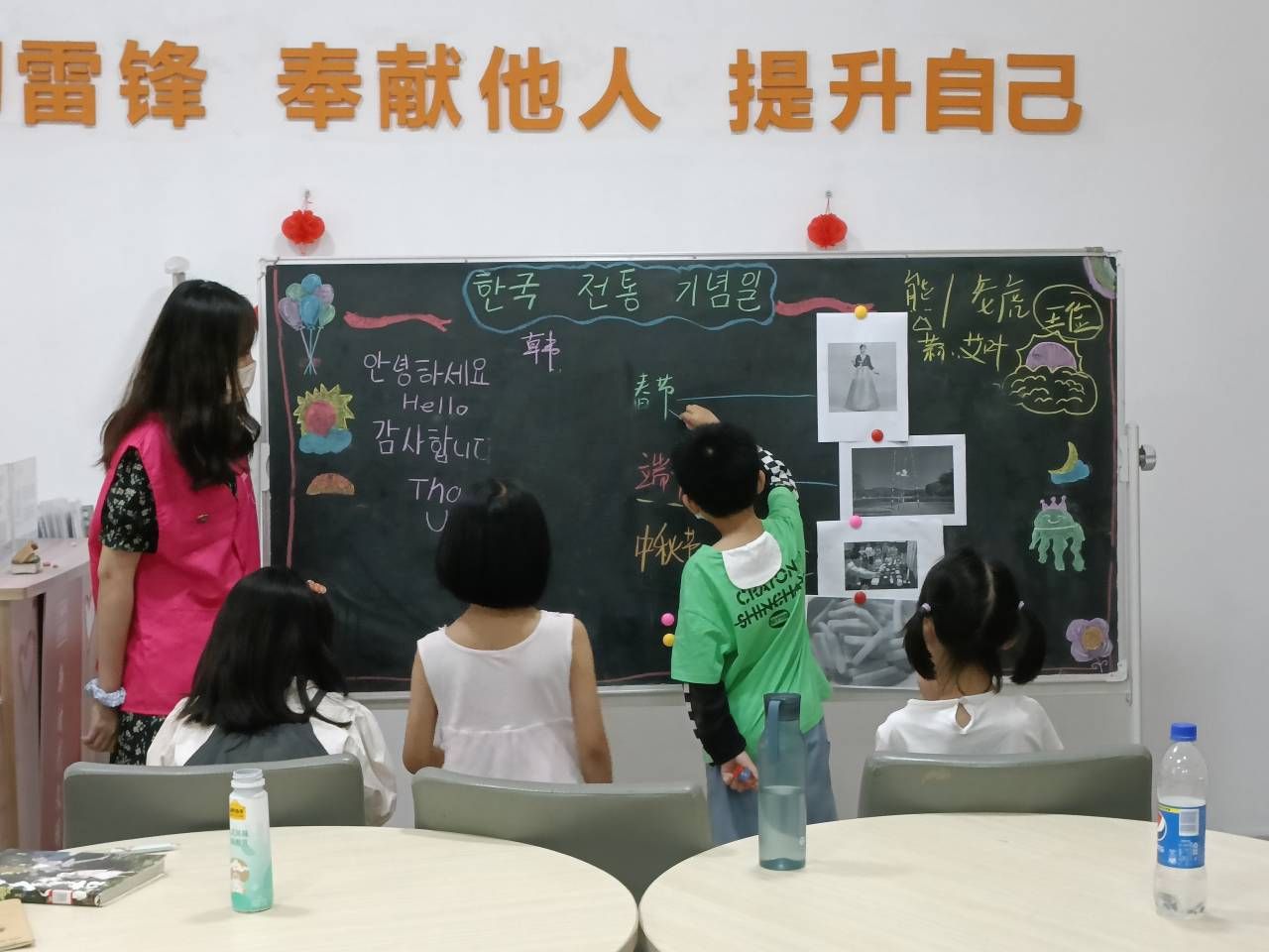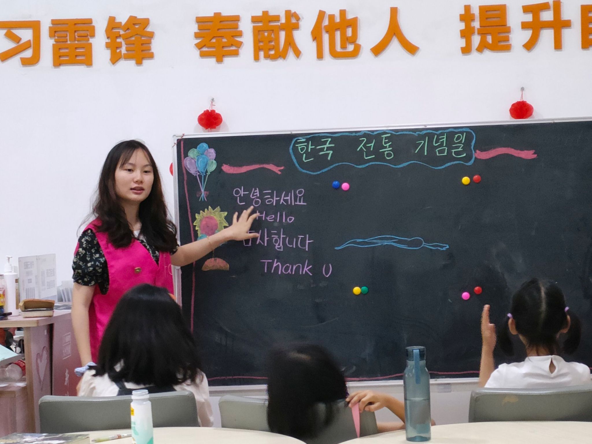 志愿者以春节、端午节、中秋节等中国传统节日为例,引导小朋友们类比思考韩国的传统节日,通过介绍两国传统节日在起源和习俗上的异同,带领小朋友们了解不同节日的文化特色。在韩语表达的教学过程中,志愿者寓教于乐,将词汇融入歌曲和手势舞中。在志愿者的鼓励下,小朋友们积极上台展示学习成果,展现出阳光自信、蓬勃向上的活力风采。