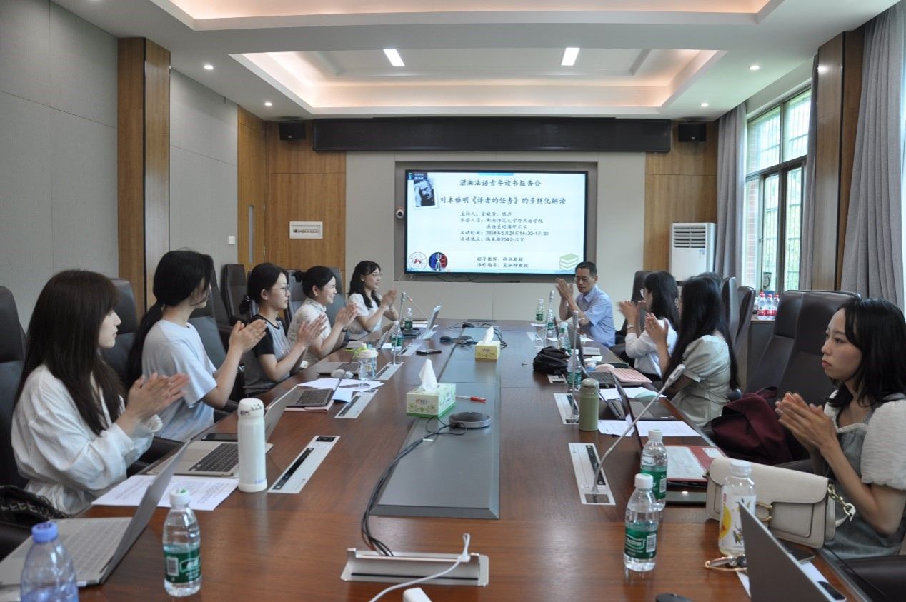 (通讯员 岳思阳 曹雪)2024年5月24日下午,太阳成集团tyc33455cc官网法语系在腾龙楼204会议室成功举办了首届“潇湘法语青年读书报告会”。本届读书报告会的主题是“本雅明《译者的任务》的多样化解读”,共有11位硕博研究生从不同的角度,结合不同的材料谈论了各自的思考与感悟。张弛教授和吴泓缈教授对学生的发言进行了精彩点评。本次会议由法语系2023级博士生金晓童和2022级研究生钱丹主持。