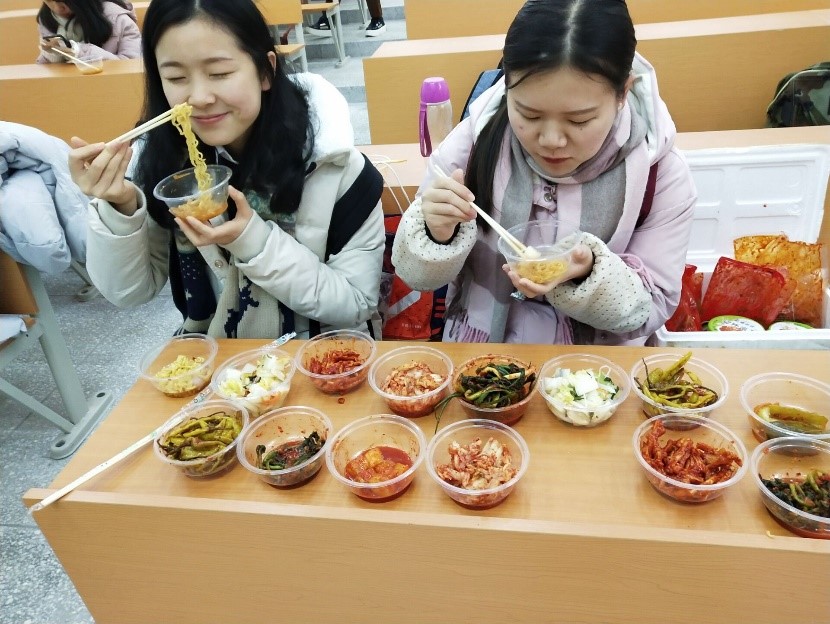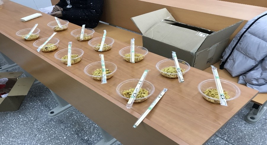 活动开始前,阿里郎韩语社理事们准备好碗筷,将拉面和不同种类的泡菜放入小碗中,整齐地摆放好,并提前为会员们准备好手套和卫生纸。在有序组织社团会员签到后,副理事长汤张昕宣布特色活动正式开始。每位会员先领取一小碗辛拉面,拉面分为香菇牛肉和辣白菜两种口味,接着试吃了各种各样的泡菜,如辣白菜、萝卜块、黄瓜、辣椒等。在试吃活动中,欢声笑语溢满了教室。活动最后,阿里郎韩语社理事打扫了教室卫生。