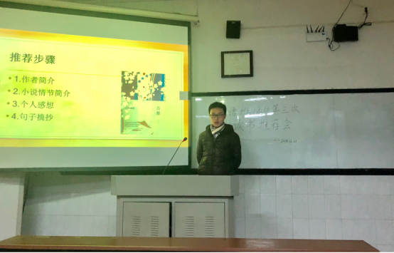 邱奕妍在介绍活动目的后,对活动内容进行简要说明。此次读书推荐会由八名同学分享自己的读书体验。其中,李晓璐推荐的《小王子》温馨动人,从大人的视角来分析这部作品的精彩之处。紧接着,鲁雪静介绍的《我不喜欢这世界我只喜欢你》中的精彩片段引发观众共鸣,琐碎的生活小事让大家体会到了感动。尹思行则从作家介绍、写作意图、作品简介以及美句介绍四个角度介绍了《雪国》这本书,条理清晰,通俗易懂。活动最后,杨柳对活动进行总结,她认为大家的阅读范围广泛,值得鼓励,她建议大家多阅读一些人文社科类的书籍,拓宽自己的视野,提升自己的素养。邱奕妍对杨柳的总结表示感谢,并宣布读书推荐会结束。