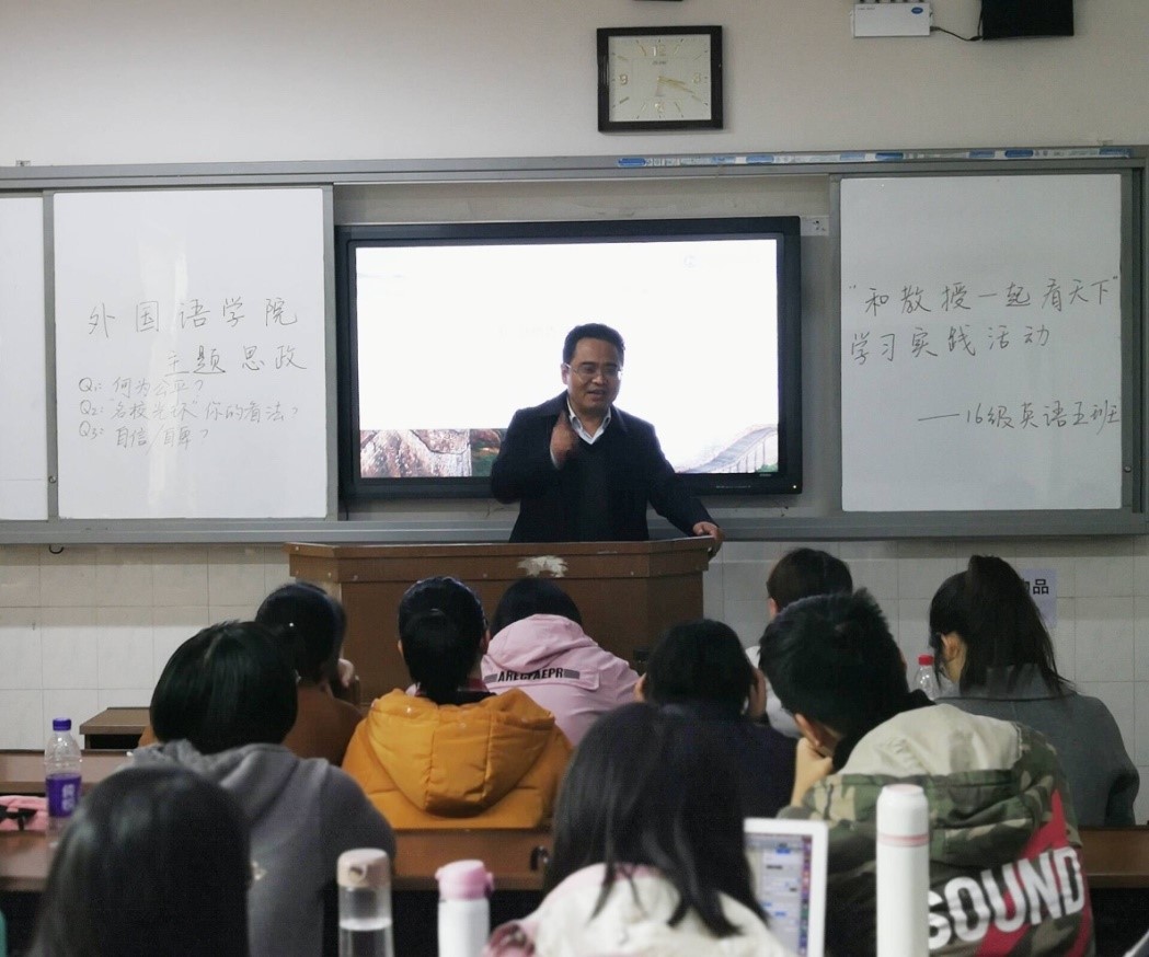 (通讯员 陈宇帆)3月28日下午,太阳成集团tyc33455cc官网16级英语五班“和教授一起看天下”之“我为双一流学科做贡献”主题活动在外院401教室顺利举行。此次活动由16级英语五班举办,英语五班40名同学和思政指导员肖华峰教授一同参加了此次活动。