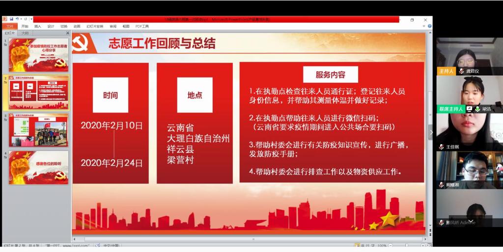 班会伊始,龚君仪通过一个抗击疫情的视频带领大家回顾疫情,在讨论环节中,同学们踊跃发言,纷纷对抗疫中的英雄人物致以敬意。随后,梁洁分享自己在抗疫过程中的志愿者经历和心得。最后,滕凤娇同学和王佳祺同学朗诵抗疫诗歌:“风雨同心,众志成城;爱聚一方,情系武汉;中国加油!武汉加油……”作为此次班会的总结。会后,张元强对此次活动进行点评,他肯定了同学们的良好的精神风貌,希望同学们在此次疫情防控中汲取养分。