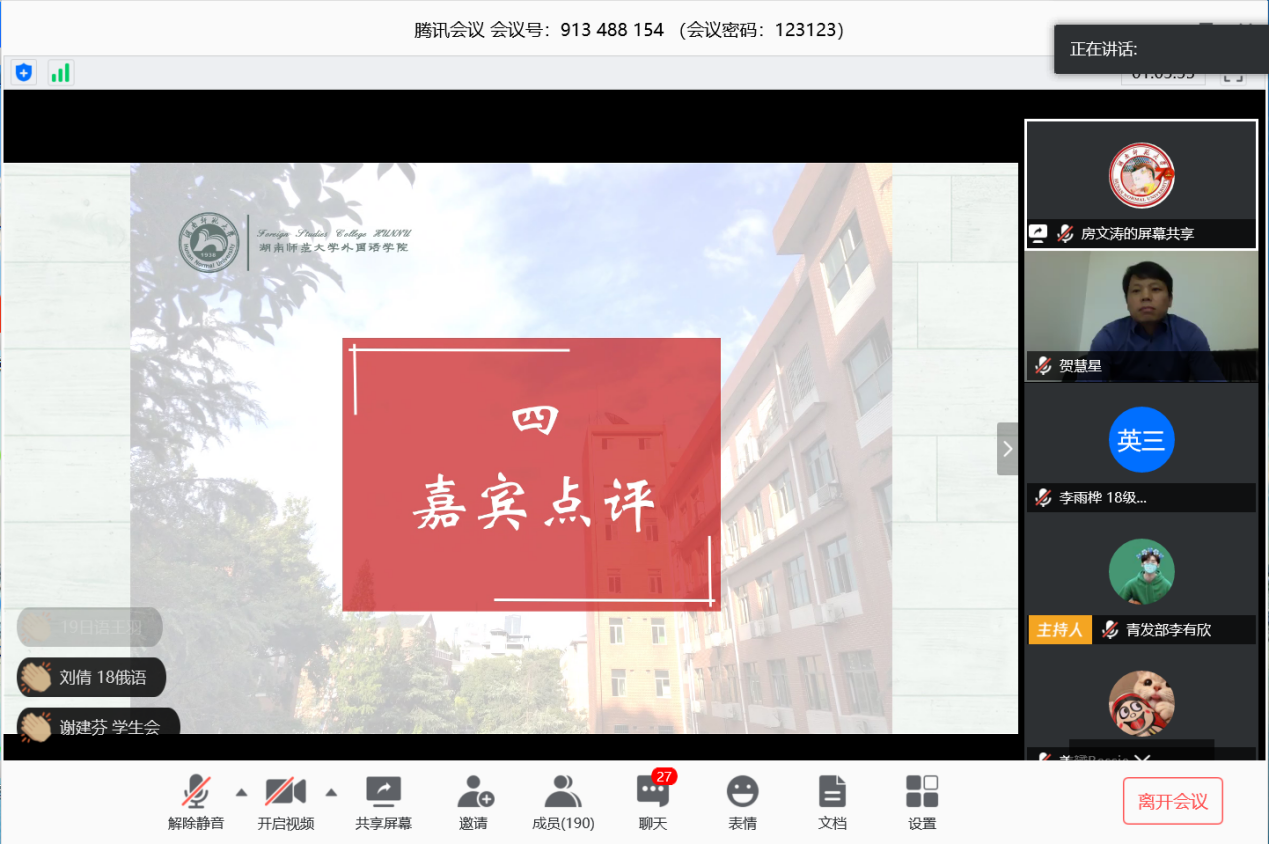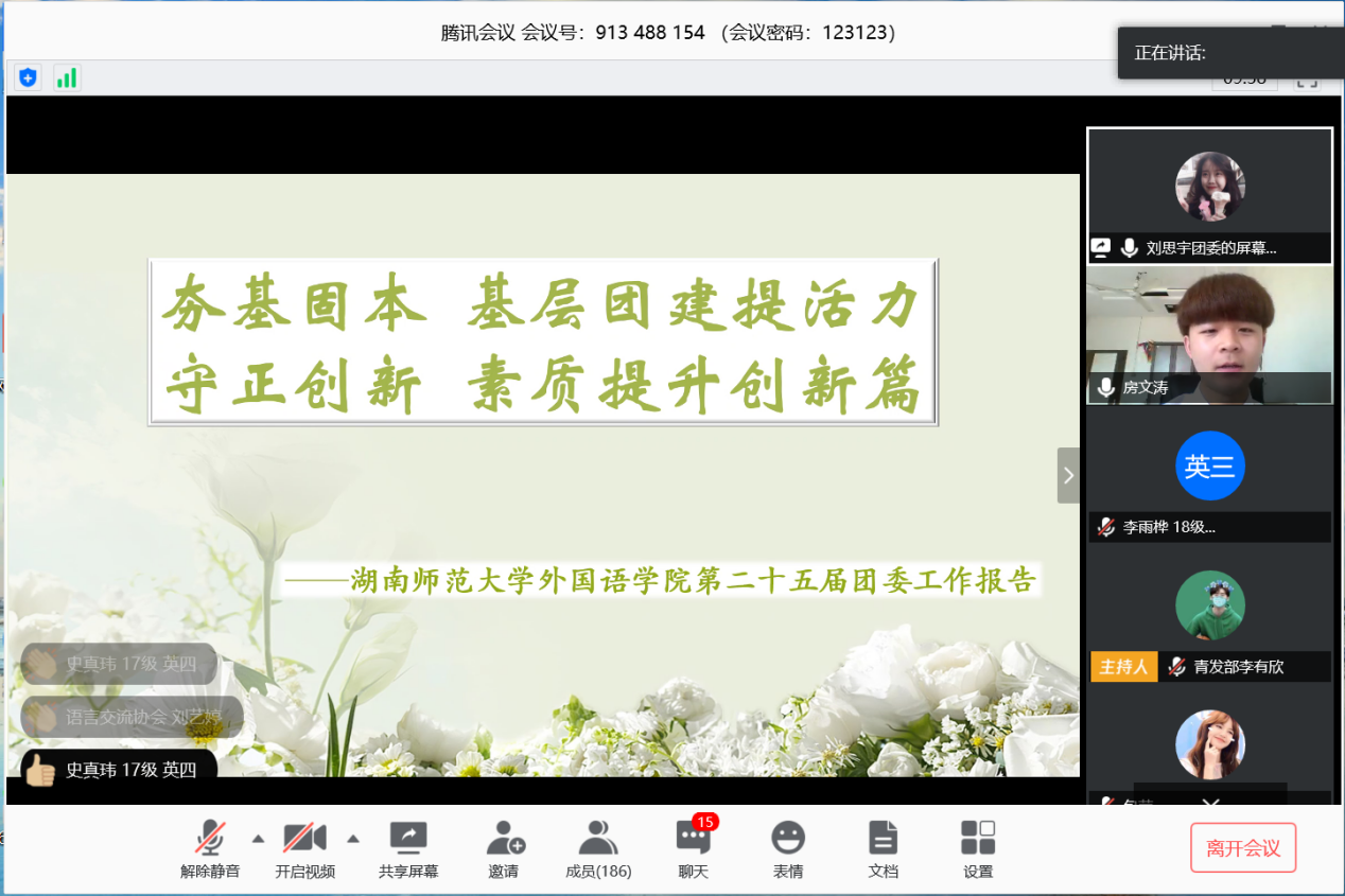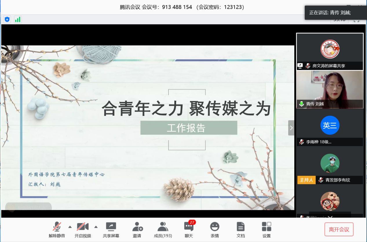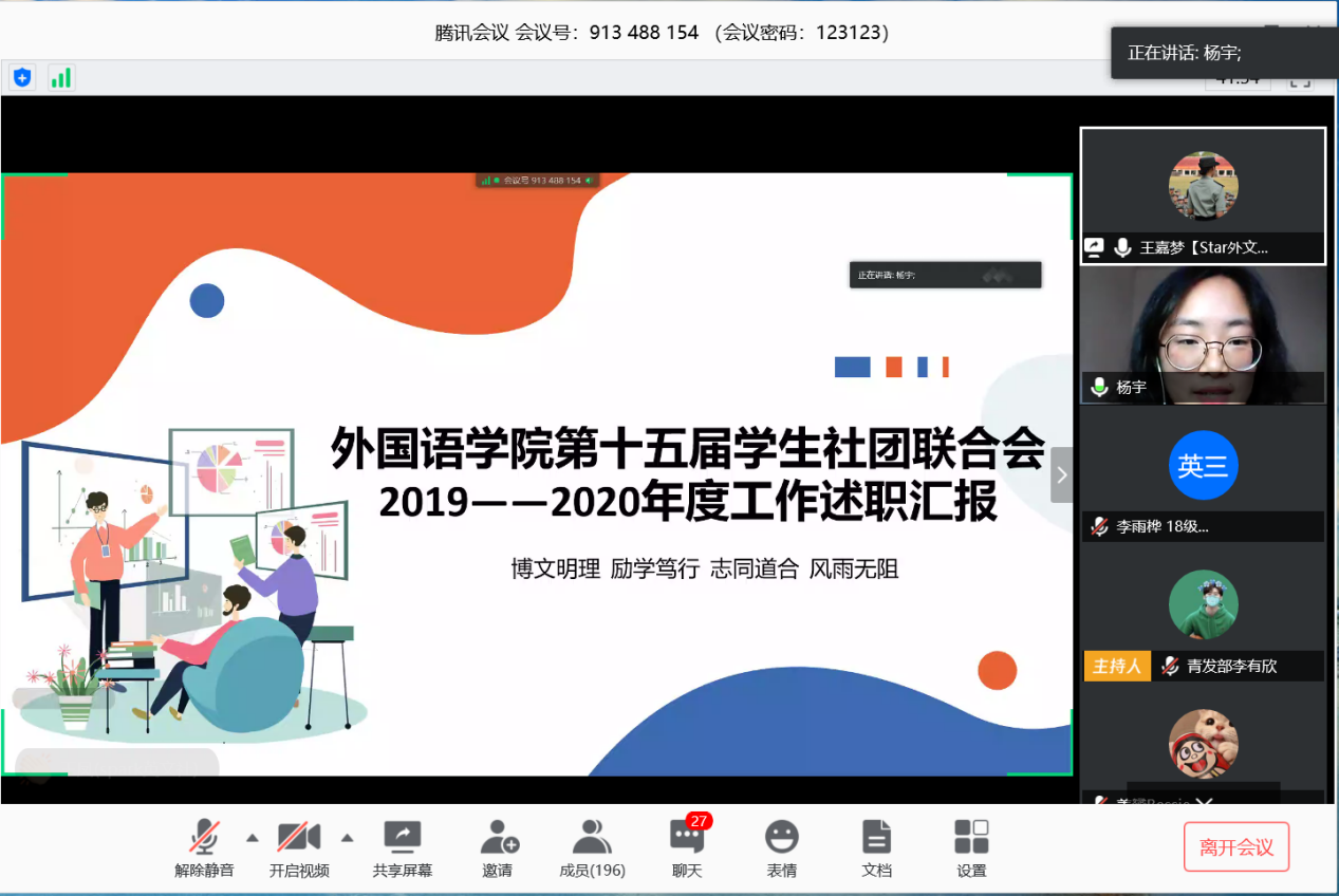 院团委学生副书记房文涛、院学生会主席欧阳嫣霞、院学社联主席杨宇、院青年传媒中心主任刘越依次从“德、能、勤、绩、学”五个方面,对部门年度工作进行回顾、总结与评价,概述工作成就与不足,并统及部门工作提出相应的改进方案。