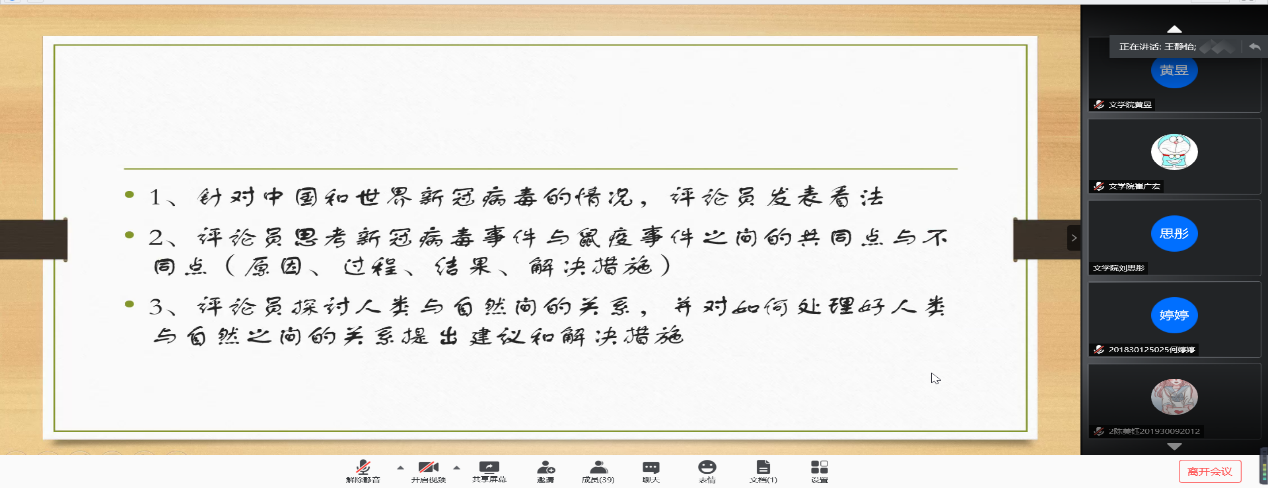 活动中,王静怡介绍了《鼠疫》的主要内容和写作背景,随后播放《鼠疫》片段。她将鼠疫和新冠疫情做出对比,展示了中国和国际在抗疫中所作出的努力,引导评论员们思考鼠疫和新冠疫情的相同点和不同点,并提出评论员们要认真思考和展望如何处理好人类与自然的关系的要求,鼓励评论员们建言献策。评论员们畅所欲言,发表自己的看法和见解,就主持人所提问题提出自己的建议。