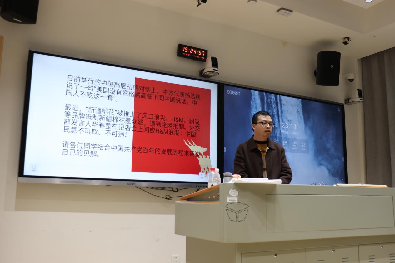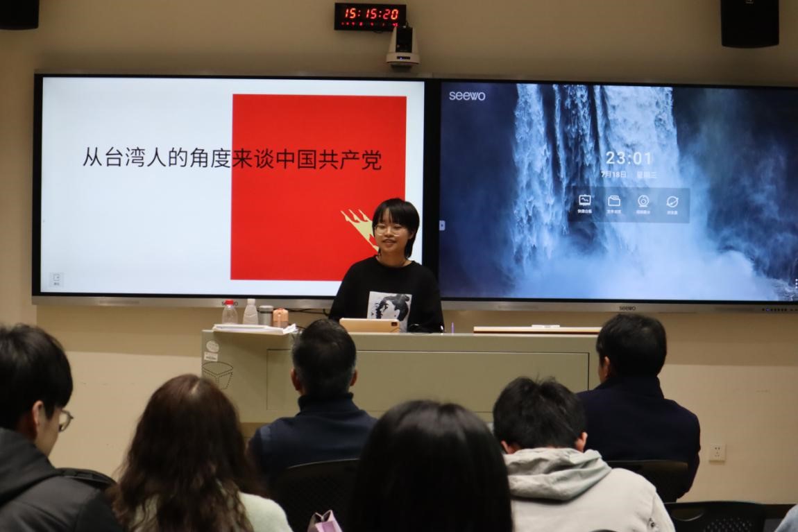 活动围绕“知党恩,创一流”的主题,通过回顾党的百年发展历史分析了党的领导智慧,并探讨了日语专业学生在新时代的责任与担当。许欣怡结合共产党建党一百周年实际,对本次活动进行介绍,并作为学生代表从台湾同胞的角度分享了中国共产党领导下社会生活的变化。其余学生代表对“新疆棉花事件”和“中国高层战略会议”等社会热点事件发表看法和意见,探讨新时代背景下日语专业学生应承担的社会责任。互动环节,同学们积极向两位思政指导员提问,贺慧星耐心解答了同学的疑问。随后,陈小法教授就中国共产党诞生过程中的中日联系进行了讲解。