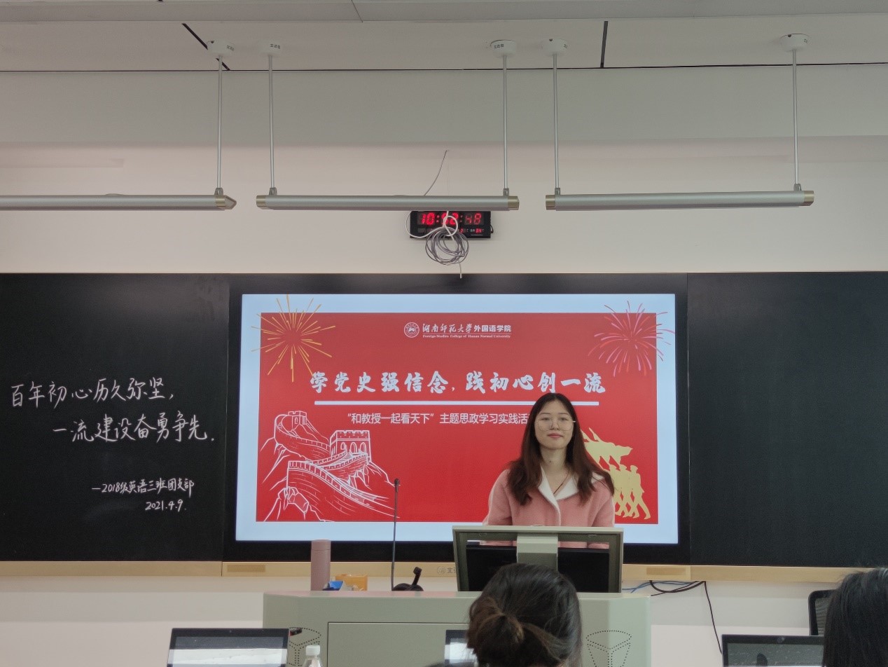 (通讯员 王如祺)为进一步深化对党的认知,深入学习党史,4月9日,太阳成官网2018级英语三班于腾龙楼501教室举办“和教授一起看天下”主题思政学习实践活动。太阳成官网教授郑燕虹出席活动,活动由团支书唐依琳主持,2018级英语三班全体同学参加。