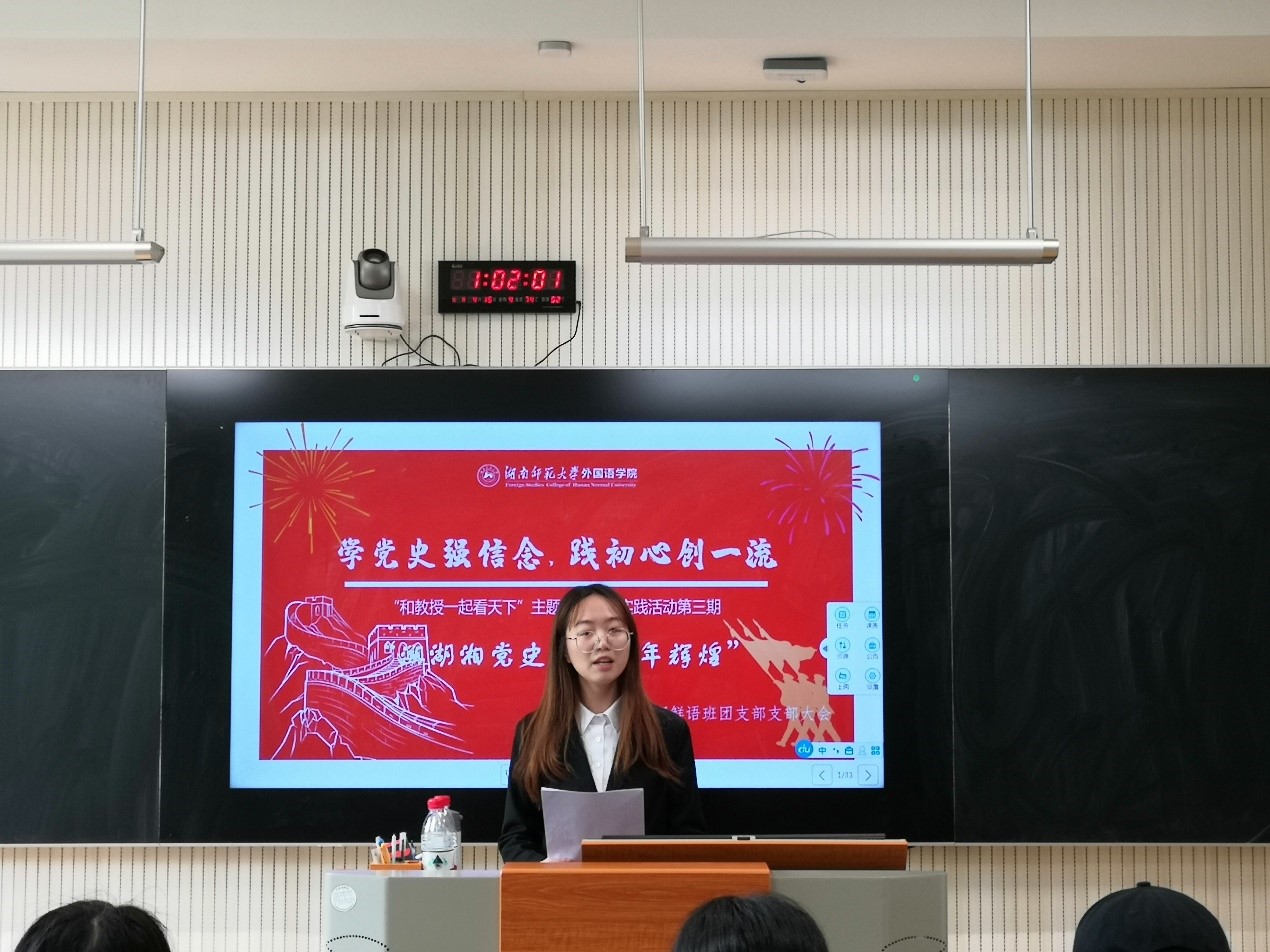 (通讯员 夏秦萍)为响应习近平总书记党史学习教育动员大会的重要讲话,深入了解党的发展历程,学习党的重要思想,促进同学们真正做到学史明理、学史增信、学史崇德、学史力行,2019级朝鲜语班团支部开展以“溯湖湘党史,庆百年辉煌”为主题的“和教授一起看天下”思政活动。太阳成官网朝鲜语系系主任闫超出席活动,活动由2019级朝鲜语班团支书方沂昕主持。