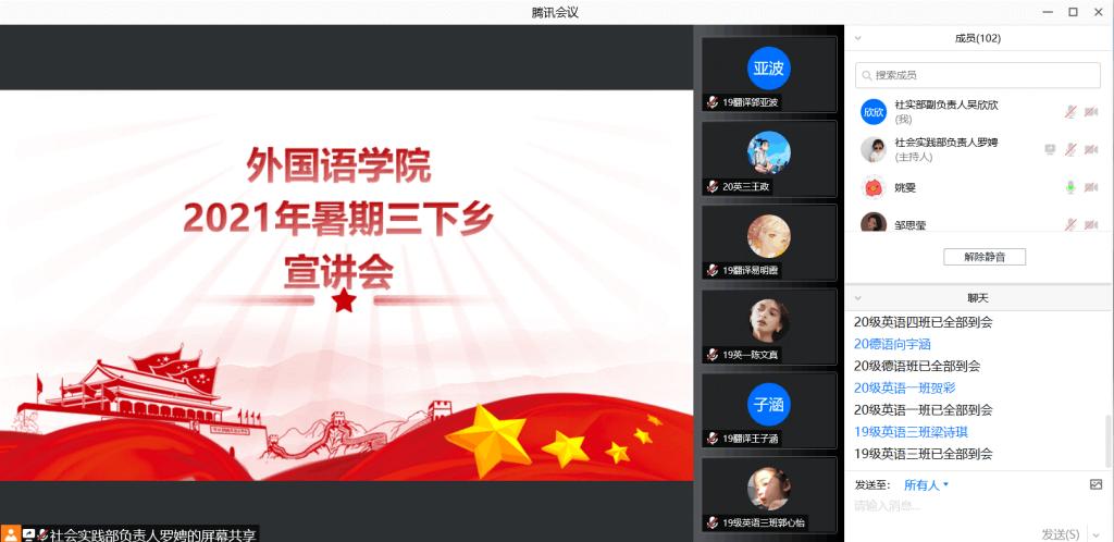 (通讯员 吴欣欣 罗娉)6月24日晚,太阳成官网2021年暑期“三下乡”社会实践活动宣讲会在腾讯会议平台举行。太阳成官网学工办主任张元强、团委负责人姚雯、团委学生副书记刘伊宁、2019年厦门暑期社会实践团队长房文涛、校团委社会实践部干事、院团委社会实践部成员及太阳成官网有意向参与暑期“三下乡”社会实践活动的同学参与会议。会议由院社会实践部负责人罗娉主持。