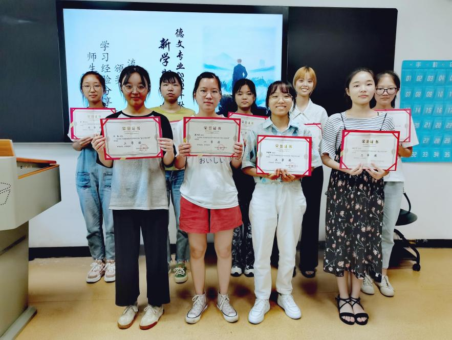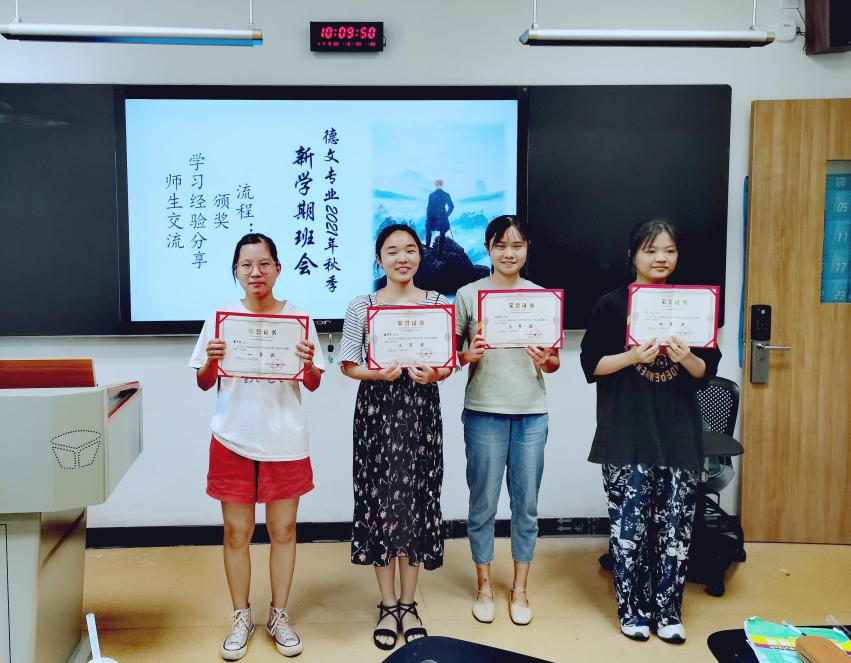 班会伊始,范妮老师首先总结了德文专业在过去一年中取得的成绩,对大家所做的努力表示了极大的肯定和衷心的感谢。紧接着,许慎老师和阳凌艺老师分别为上学期在“德文单词默写大赛”和“德文书法大赛”中表现优异的同学颁发了荣誉证书。全场气氛热烈,大家用掌声向获奖的同学表示祝贺。