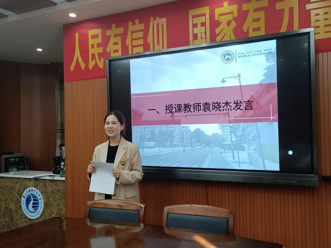 会议伊始,实习队队长袁晓杰对汇报课进行自我反思以及设计理念分享,并对麓外和学院提供的平台以及老师与队友们在磨课、备课过程中提供的支持表示感谢。王芳和李志红都给予本节汇报课高度评价。王芳表示,本节汇报课教学设计巧妙,选材贴近学生日常生活,展现了授课教师良好的教师素养和扎实的教学功底。李志红在会上介绍了汇报课的准备过程和细节,赞扬了实习队在备课、磨课过程中展现出的团队精神,同时也对袁晓杰在课堂中照顾不同层次学生,以学生为课堂主体的意识表示了肯定。