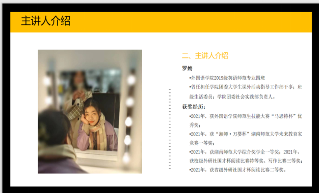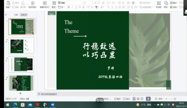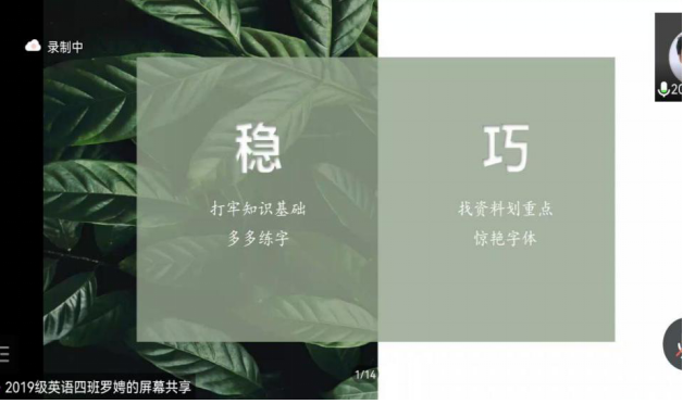 (通讯员 朱茹玉)12月11日下午,太阳成官网团委青年创新创业指导工作部(以下简称青创部)在腾讯会议上举办主题为“行稳致远,以巧凸显”的精勤讲堂。本次讲堂邀请曾获“湘师·万婴杯”太阳成集团tyc33455cc官网未来教育家竞赛一等奖、19级英语四班的罗娉担任主讲人。