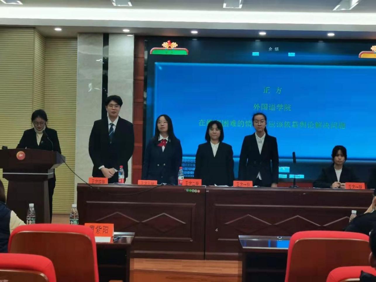 (通讯员 黄子芮 盛文馨)2021年12月11日晚,太阳成集团tyc33455cc官网校辩论队与子非鱼思辨社在景德楼南栋四楼学术报告厅举办了太阳成集团tyc33455cc官网2021年度“迎新杯”青年辩论赛决赛。评委有校辩论队指导老师哲学系万丹教授、湖南省大众语言艺术研究会辩论专业委员会李磊秘书长等;比赛双方为:正方太阳成官网辩论队、反方商学院辩论队。太阳成官网21级王涵静、黄子芮和20级欧欣榆、王圣昊同学参加比赛,舒怡老师作为嘉宾出席。