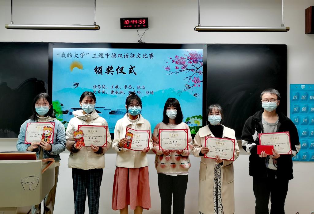 论坛上举行了“我的大学”中德双语征文比赛颁奖仪式,范妮为获奖同学颁发荣誉证书和奖金。寒假期间,全班同学结合自身大学生活的体验,就“我的大学”这一主题认真用双语撰写了文章。开学后,德语系范妮、阳凌艺、许慎三位教师对文章进行了评审,并遴选出六个优秀作品:李思、王敏、张迅三位同学获得此次征文比赛“佳作奖”,曹淑娴、刘嘉玲、赵通三位同学获“优秀奖”。