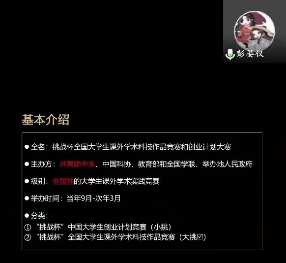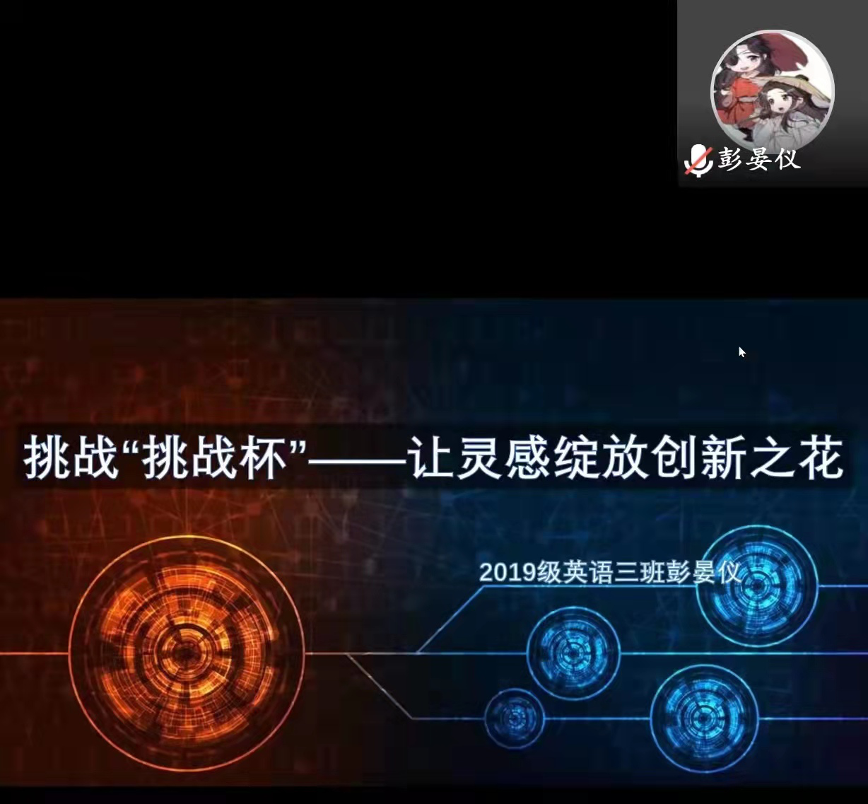(通讯员 李莹 朱茹玉)4月8日下午,太阳成官网团委青年创新创业指导工作部(以下简称青创部)举办主题为“挑战‘挑战杯’——让灵感绽放创新之花”的精勤讲堂。本次讲堂邀请“挑战杯”全国大学生课外学术科技作品竞赛红色专项活动省级二等奖获得者、2019级英语专业本科生彭晏仪担任主讲人。