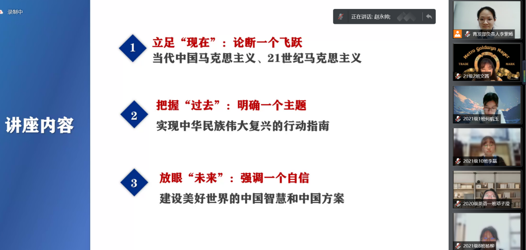 赵永帅以“习近平新时代中国特色社会主义思想及其历史地位”为主题,围绕立足现在、把握过去、放眼未来三个方面论断一个飞跃、明确一个主题、强调一个自信。他在讲座中提出问题、给出实例、分析思路、讲述理论,为同学们阐述了习近平新时代中国特色社会主义思想是当代中国马克思主义、21世纪马克思主义,是实现中华民族伟大复兴的行动指南,是建设美好世界的中国智慧和中国方案。