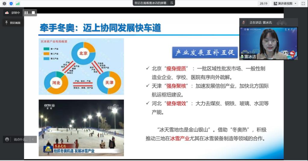 主讲人雷冰洁以“筑梦冰雪,同向未来——冬奥点燃京津冀协同发展新引擎”为主题,从经济合作、产业互补等角度向学员们分析了北京冬奥会能够推动京津冀协同发展的原因,并指出冬奥会的举办是京津冀地区协同发展实现新突破的过程。