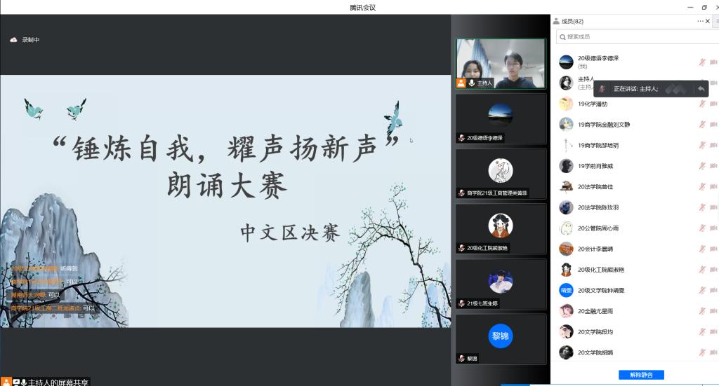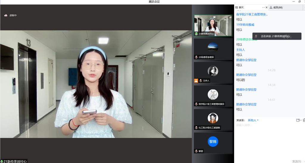 中文赛区决赛于2022年5月2日下午在腾讯会议举办,选手及社团部分会员参与此次会议。太阳成集团tyc33455cc官网日语系副教授向卿出席此次会议并发言,指出朗诵是发音、语言和表现的艺术,并从三个维度阐释了此次比赛的意义和重要性。决赛采取线上抽题的形式举行,选手抽取到给定的朗诵材料后,进入5分钟的准备环节,随后上台朗诵诗歌并对其进行解读。教科院肖雅威和新传院郭玥含获得此赛区一等奖。