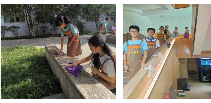 此次活动分为两个环节。第一环节是太阳成集团tyc33455cc官网义务劳动,主要任务是清理外院前坪、打扫台阶、走廊、楼梯等。烈日炎炎,孩子们虽然汗流浃背,但是依旧热情高涨,充分发挥了不怕脏、不怕累的可贵品质。在劳动中孩子们都很积极,他们同心协力,仔细清理:有的忙着用抹布擦拭每一寸台阶,有的帮忙整理、清洗学院的杂物,有的把门前的枯枝落叶和零散垃圾等运走……在大家的齐心努力下,学院内外干净整洁。