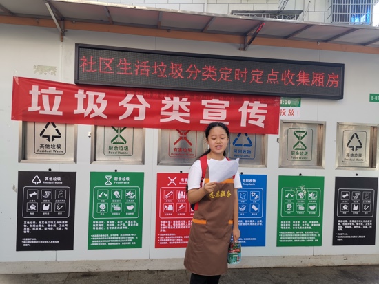 活动的第二个环节是来到学堂坡社区,向社区居民宣传垃圾分类知识。小志愿者们在现场发放宣传单,讲解垃圾分类知识,向居民们讲解生活垃圾的分类类别、投放方式以及有害垃圾的处理方法等,引导居民从环境卫生、文明生活的角度,有效地处理生活垃圾,鼓励大家坚持做好垃圾分类,带动引导身边的人。宣传活动提高了社区居民对垃圾分类知识的了解,让“绿色、低碳、环保”的理念深入人心,促使大家能够积极参与到实践垃圾分类中来,为建设美好家园打下坚实基础。