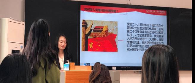 课堂上,李老师简要介绍了科教兴国战略的内涵,并引导大家思考“外语人如何贯彻二十大精神与科教兴国战略”。结合自己的翻译经历,李老师指出外语人从事着对外交流工作,应当坚定文化自信,利用自身语言优势,主动承担起讲好中国故事的重任。