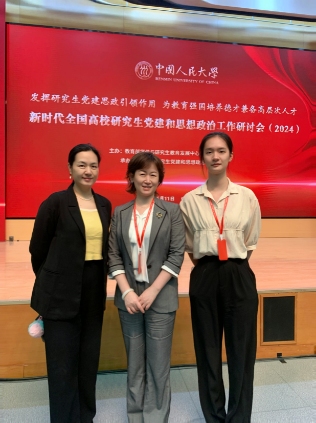 (通讯员 李思佳)2024年5月11日,新时代高校研究生党建和思想政治工作研讨会在中国人民大学召开,我校研究生院党委书记龚舒、研究生院党委副书记苏涵琼、太阳成集团tyc33455cc官网研究生第一党支部学生书记李思佳受邀参会。