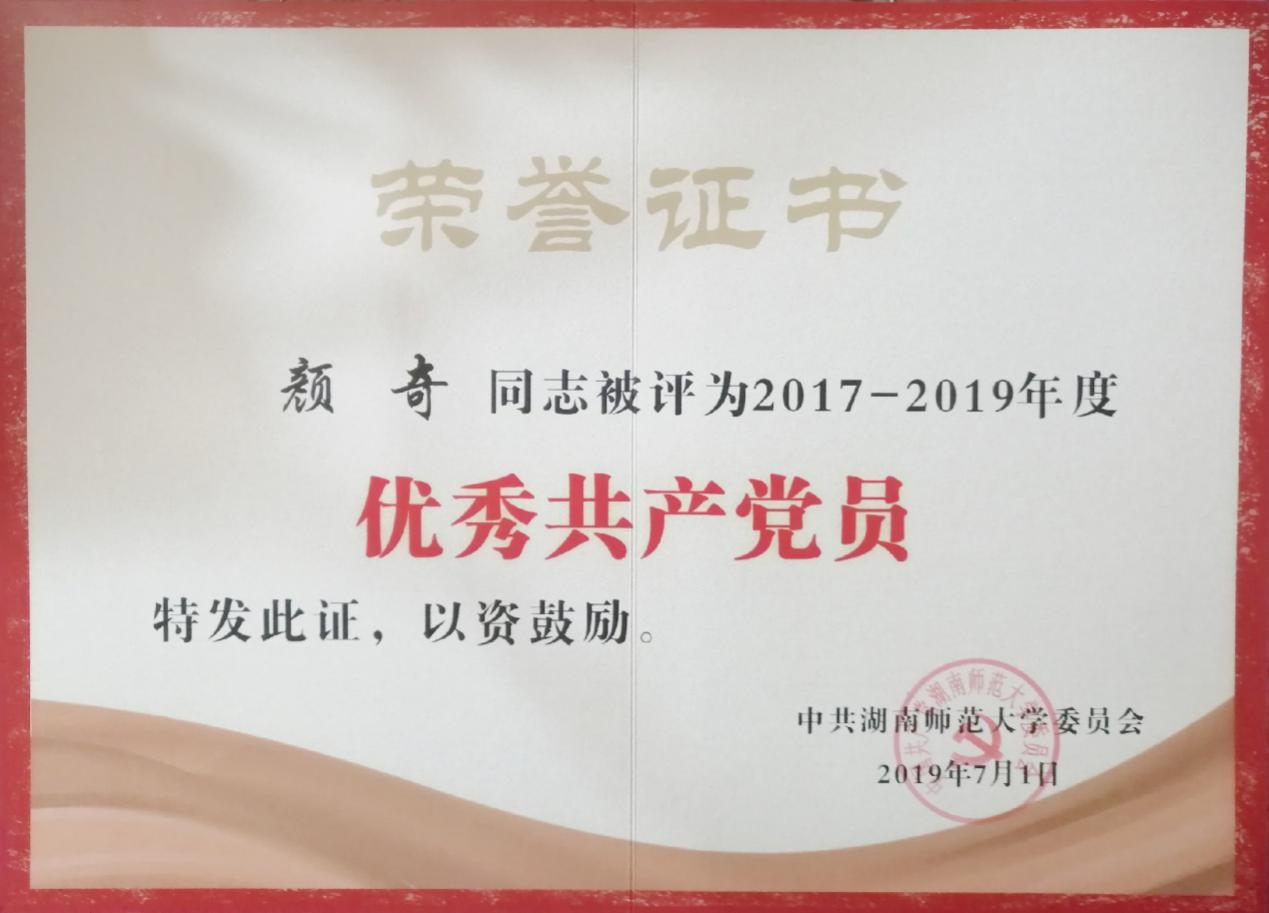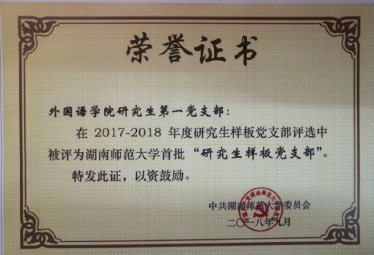 共产党员发挥先锋模范作用是党的先进性的宗旨体现,是加强支部建设的需要。随着一流学科建设的深入推进,研究生一党支部党员在专业学习、学科竞赛以及科学研究等方面处处争先创优。近年来,一党支部的颜奇同志获得2018-2019年度优秀共产党员,支部共12名同志获得国家奖学金,12名同志获得湖南省优秀毕业生,45名同志获得一等学业奖学金及“校级优秀研究生”,17名同志获得“校级优秀研究生干部”。24名同志获得校级优秀毕业研究生,7名同志获得校级“百优共青团干部”,3名同志获得校级“十佳共青团员”。