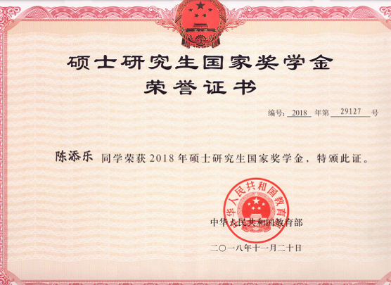 (陈添乐同志荣获2018年研究生国家奖学金)