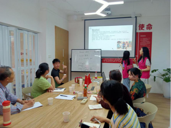 志愿者们通过视频展示、情景模拟、词句补充等多种教学方式,向社区英语爱好者介绍了购物相关的实用英语表达,理性消费的观念,为社区党员同志分享了红色励志故事《毛泽东宴请陈嘉庚》,并向他们教授该故事中“艰苦朴素”、“勤俭节约”和“优良传统和作风”的英文表达,现场积极互动、反响热烈。