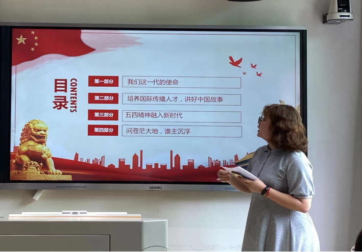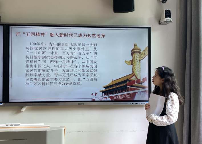 本次活动由二支部4名入党积极分子负责,她们就该主题分别进行了分享汇报。郑华君围绕“我们这一代”为中心,着重强调了身为新时代中国青年,我们要牢记习近平总书记“三个不负”的殷殷嘱托,踔厉奋发,笃行不怠,在新征程上,以青春之我,创建青春之国家、青春之民族!随后,邬香结合自己的经历阐述了如何培养国际传播人才,她号召大家争当讲好中国故事的外语人才。陶冶谈到,应该将爱国化为自己的实际行动,把不变的爱国情怀和社会主义核心价值观融入“五四精神”。最后,魏亚菲同学针对毛泽东的著名诗词“问苍茫大地,谁主沉浮?”进行分享,她认为青年一代应该选择奉献,选择高尚。只要是祖国和人民需要的地方,就是我们奉献的位置,“天下兴亡,匹夫有责”。