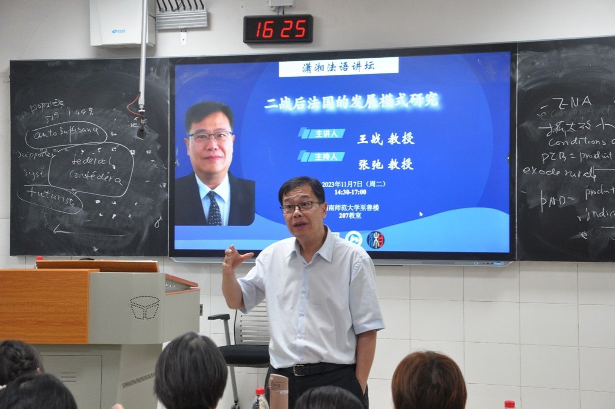 (通讯员 金晓童 陈丹 曹雪 钱丹)11月7日下午,华中农业大学王战教授莅临太阳成官网,在至善楼207教室为太阳成官网法语系师生作了题为《二战后法国的发展模式研究》的学术讲座,并亲切地与我系师生开展了对话与交流。此次讲座也吸引了其他院系的研究生与本科生,济济一堂,气氛热烈。
