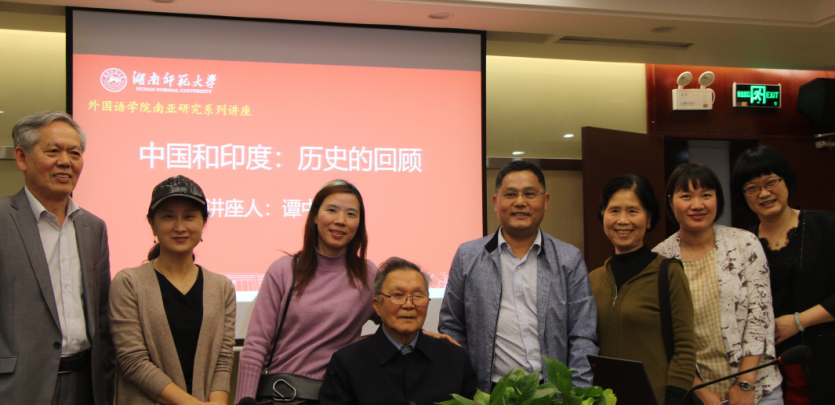 南亚研究中心主任刘曙雄教授致结束词,并向谭教授赠与具有浓郁湘楚地方文化特色的湘绣作为纪念。会后,部分教师与谭中教授合影留念。
