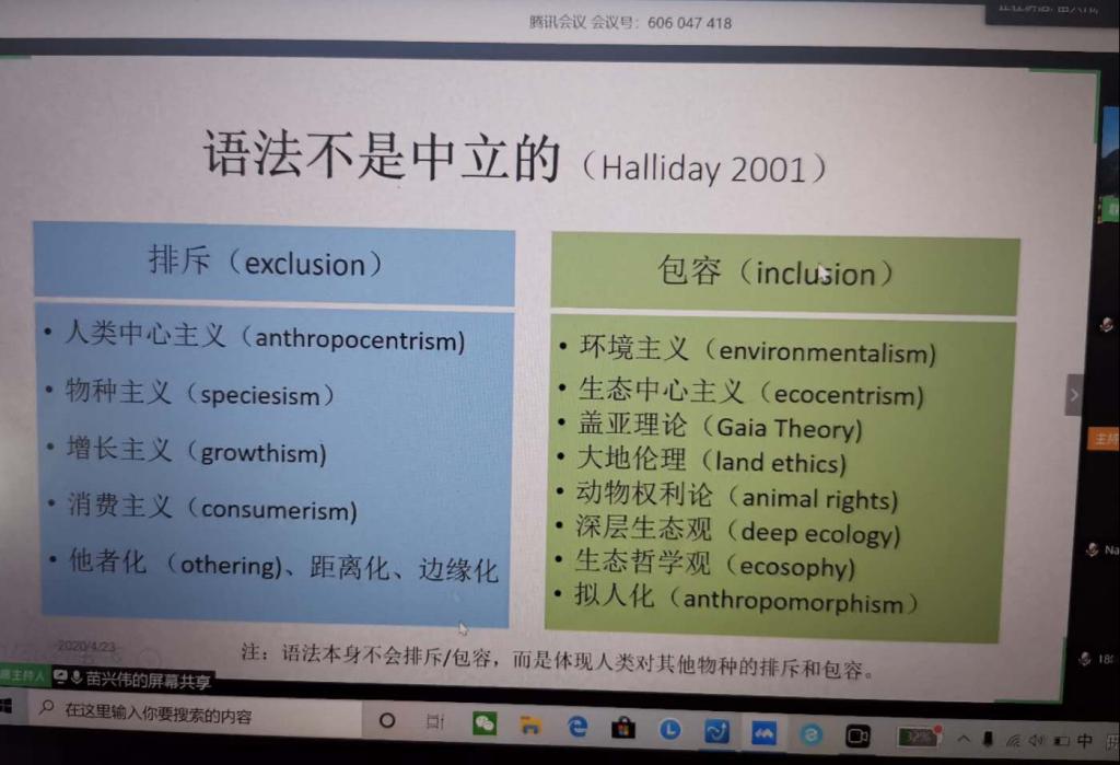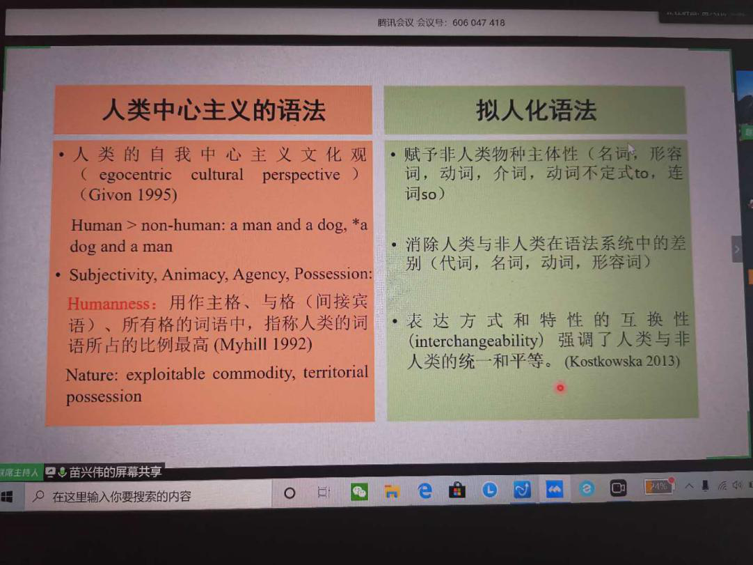 4月23日下午,北京师范大学外国语言文学学院院长、博士生导师苗兴伟教授应邀通过腾讯会议的方式为太阳成官网师生做题为“拟人化语法的生态话语分析”的学术讲座,此次讲座由太阳成集团tyc33455cc官网廖光蓉教授主持,参会师生300余人。