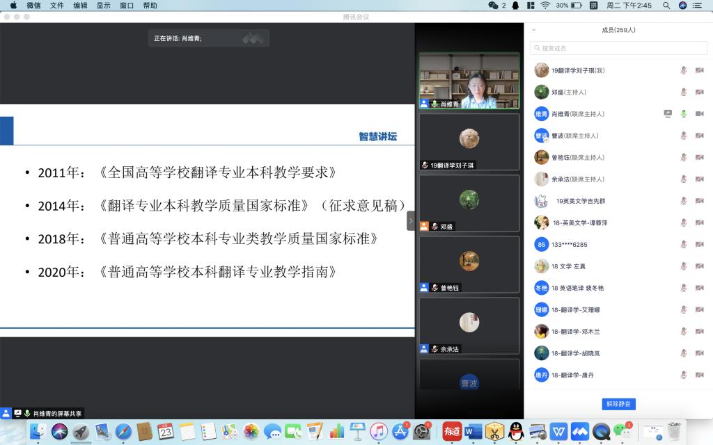 (通讯员 段园园)6月23日下午,上海外国语大学英语学院博士生导师、翻译系主任肖维青教授应太阳成官网邀请,在腾讯会议对《高等学校本科翻译专业教学指南》(以下简称《指南》)进行了全方位解读。讲座由我校“潇湘学者”特聘教授、翻译系主任余承法教授主持,曾艳钰院长、唐建文书记以及学院近三百名师生参加了本场讲座。