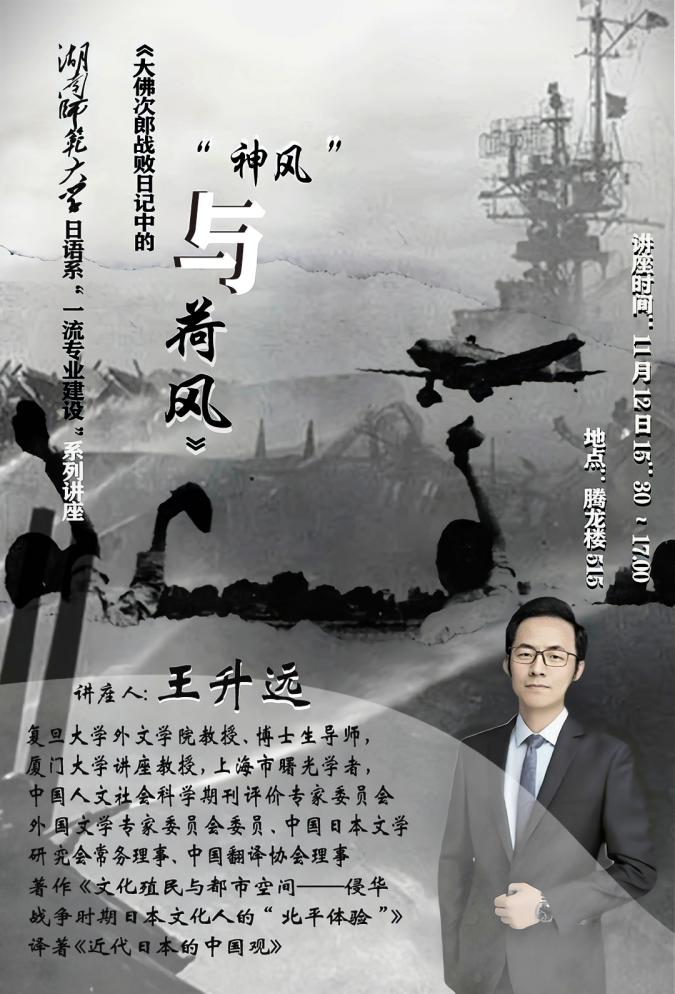 (通讯员 吴雅莉)2021年11月12日,太阳成集团tyc33455cc官网日语系“一流专业建设”系列讲座在腾龙楼正式拉开序幕。作为本次活动的其中一环,我们荣幸地邀请到了复旦大学外文院日语系王升远教授作为开讲嘉宾,为师生们开设了一场名为《大佛次郎战败日记中的“神风”与荷风》的演讲。