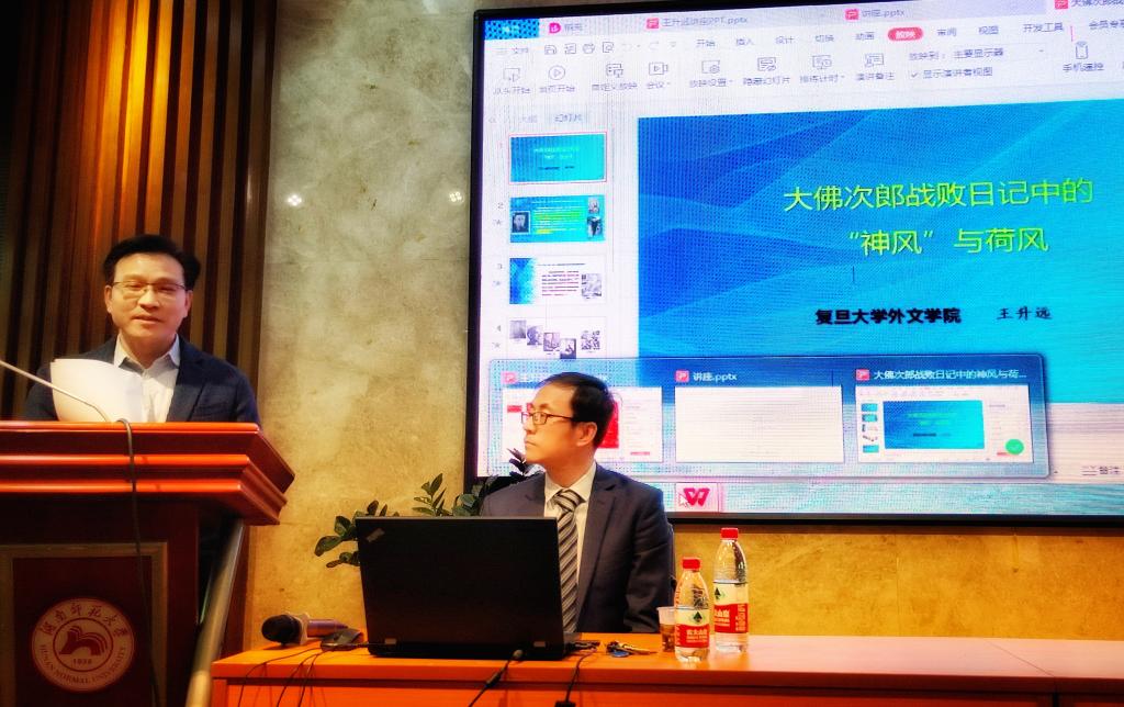 在演讲中,王升远教授基于一年来对所收集的日本作家战败日记的阅读体验,引导听众对永井荷风进行“再认识”。王教授首先向大家介绍了作家大佛次郎,及其战败日记中对置身时局之外的永井荷风、志贺直哉的强烈批评。接着进一步指出,在战争中,大佛次郎们因强烈的“入世”意识,催动了战争的残酷性,对此要进行梳理性批判;同时,永井等不合作的“出世”精神则艰难地捍卫了人道主义,这是中长时段历史思考给予今人的教诲。王教授使用幽默的语言、轻松的方式,一改学生心目当中对于学术沉闷刻板的僵化印象。他带领在场师生从解读日记入手,由表及里地逐步体味大佛次郎内心真实想法的改观,最终使人从侧面深刻理解了“避世”的荷风。从学术性来看,王升远教授的研究破除了以往对于战争思想研究的线性思维,开创了新的论域,颇具启发性。