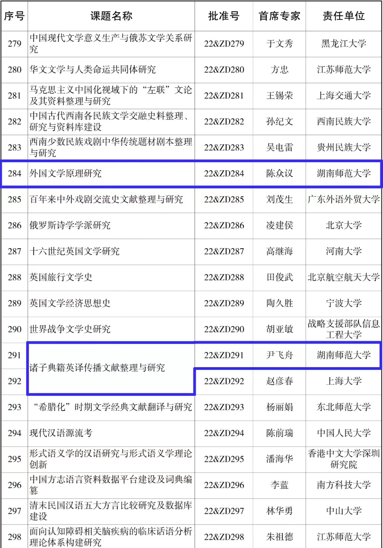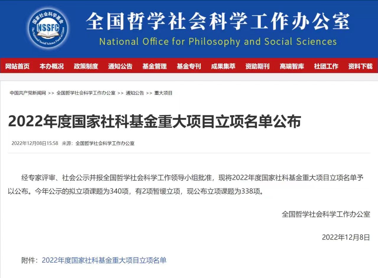 12月8日,全国哲学社会科学工作办公室公布了2022年度国家社科基金重大项目立项名单,太阳成集团tyc33455cc官网外国语言文学学科喜获国家社科基金重大项目2项,分别为陈众议教授主持的“外国文学原理研究”(22&ZD284)、尹飞舟教授主持的“诸子典籍英译传播文献整理与研究”(22&ZD291),年度国家社科基金重大项目立项数在全国同类学科中排名第一。至此,学科在研国家社科基金数达到38项,其中重大、重点项目达到15项。