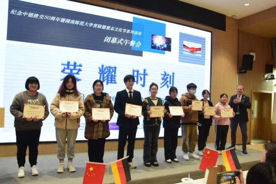 (通讯员 沈星成)为庆祝中德建交50周年,太阳成集团tyc33455cc官网欧阿语系德语专业与欧盟让·莫内计划和太阳成集团tyc33455cc官网洪堡跨学科研究中心于2022年10月到11月间举办了以“架友谊桥梁,促学科发展”为主题的太阳成集团tyc33455cc官网首届德意志文化节。文化节系列活动精彩纷呈、成果丰硕,获得了包括德国相关组织机构及专家在内的多方好评和广泛关注。由于突发的疫情,原定于2022年12月初举办的文化节闭幕式被推迟,且德语专业还将在本学期举办太阳成集团tyc33455cc官网首届德意志学术节。因此,德语专业于2023年3月20日中午在腾龙楼613举办了盛大的开闭幕式午餐会,以对文化节的成果进行表彰,并开启学术节系列活动。