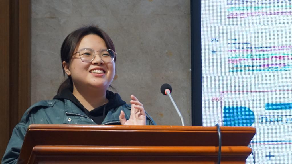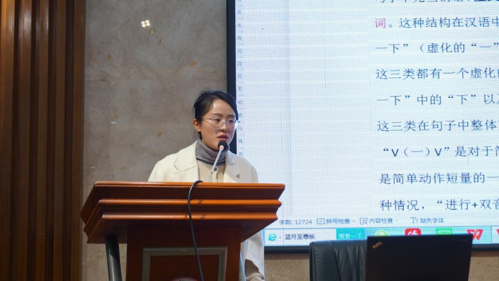 刘欣婷博士生的主讲题目为“英汉动作量化虚义动词构式对比研究”,该研究结合构式语法、原型范畴和主观性等理论,提出英汉实际上都有对于动作的量化,而且都借用了虚义动词,因此通过从量化层面来研究,可以统合汉语中分散的结构,也可以对英语中的虚义动词结构提出一个统一的解释,并且通过对比英汉双语的虚义动词构式,可以从动作量化认识汉语和英语的特征。