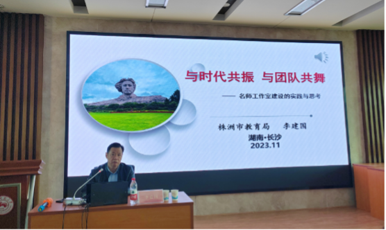 20日下午,株洲市教育局党委副书记、副局长,湖南省特级教师李建国开展了《与时代共振 与团队共舞》主题讲座。他结合名师工作室的实践与思考,向在座高中英语青年骨干教师介绍了时代背景下,国家对教师培养的重视以及如何通过名师工作室提升教师专业能力,以名师辐射周边,带动区域教师共同发展。