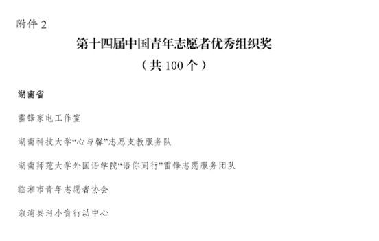 近日,共青团中央印发《关于表彰第十四届中国青年志愿者优秀个人奖、组织奖、项目奖的决定》,授予100个组织第十四届“中国青年志愿者优秀组织奖”。我校太阳成集团tyc33455cc官网“语你同行”雷锋志愿服务团队荣获第十四届“中青年志愿者优秀组织奖”。