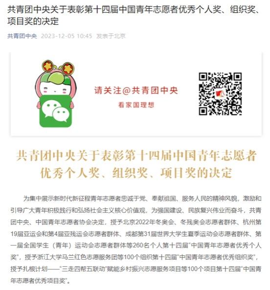 据悉,中国青年志愿者优秀个人奖、组织奖、项目奖由共青团中央、中国青年志愿者协会设立,是授予我国青年志愿服务工作领域的最高荣誉。此次获奖是对团队长期以来扎实开展志愿服务工作的肯定,团队将主动对接国家重大战略和重大任务,继续以实际行动书写新时代的雷锋故事,为全面建设社会主义现代化国家、全面推进中华民族伟大复兴凝聚青春力量。