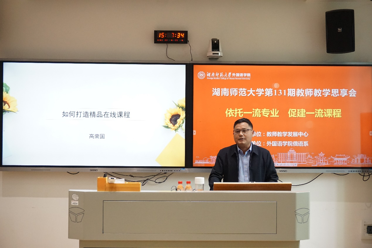 高荣国教授以其主持的湖南省在线精品开放课程《19世纪俄罗斯文学史》为例,以“如何打造精品在线课程”为主题,从课程构思、团队组建、脚本撰写、课程录制、后期制作、课程推广工作等方面向与会教师介绍了如何建设在线课程。高荣国教授认为,在课程选择时,教师应选择与自己研究方向接近且有线下授课基础的课程,组建年龄结构合理的较强课程团队。在课程设计时,应注意课程视频时长,选取重点、难点和需要拓展部分录制成视频,精心设计线上课程章节和脚本,提供多样化的课程辅助资料,挑选好的课程技术团队与上线平台。同时,高荣国教授结合《19世纪俄罗斯文学史》在线课程的建设情况,向与会教师介绍了国家级一流本科课程申报的前期准备工作和注意事项。